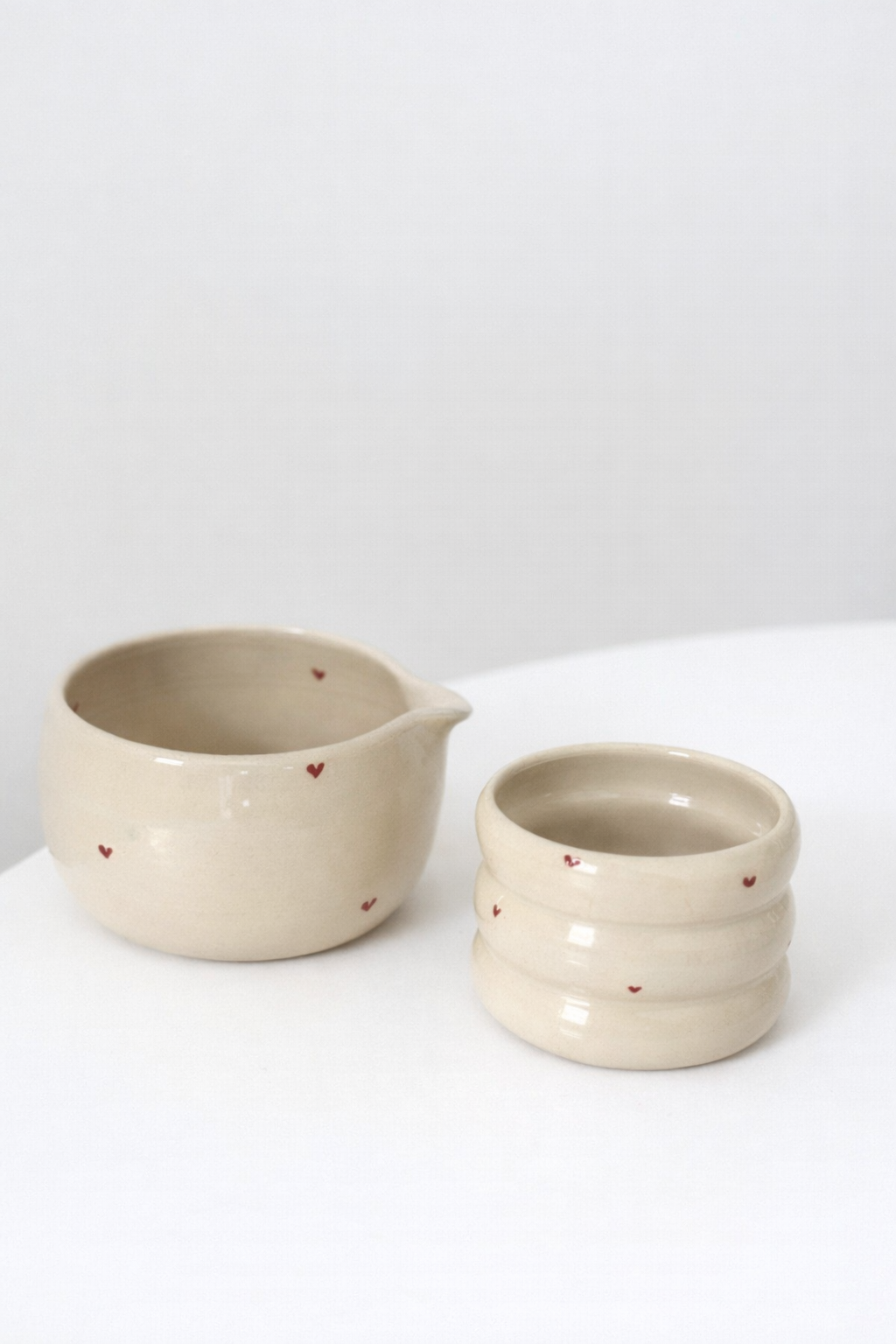 Jede dieser Tassen wird von mir auf der Drehscheibe geformt, von Hand verziert und mit roten Herzen versehen – jedes Stück ein echtes Unikat.