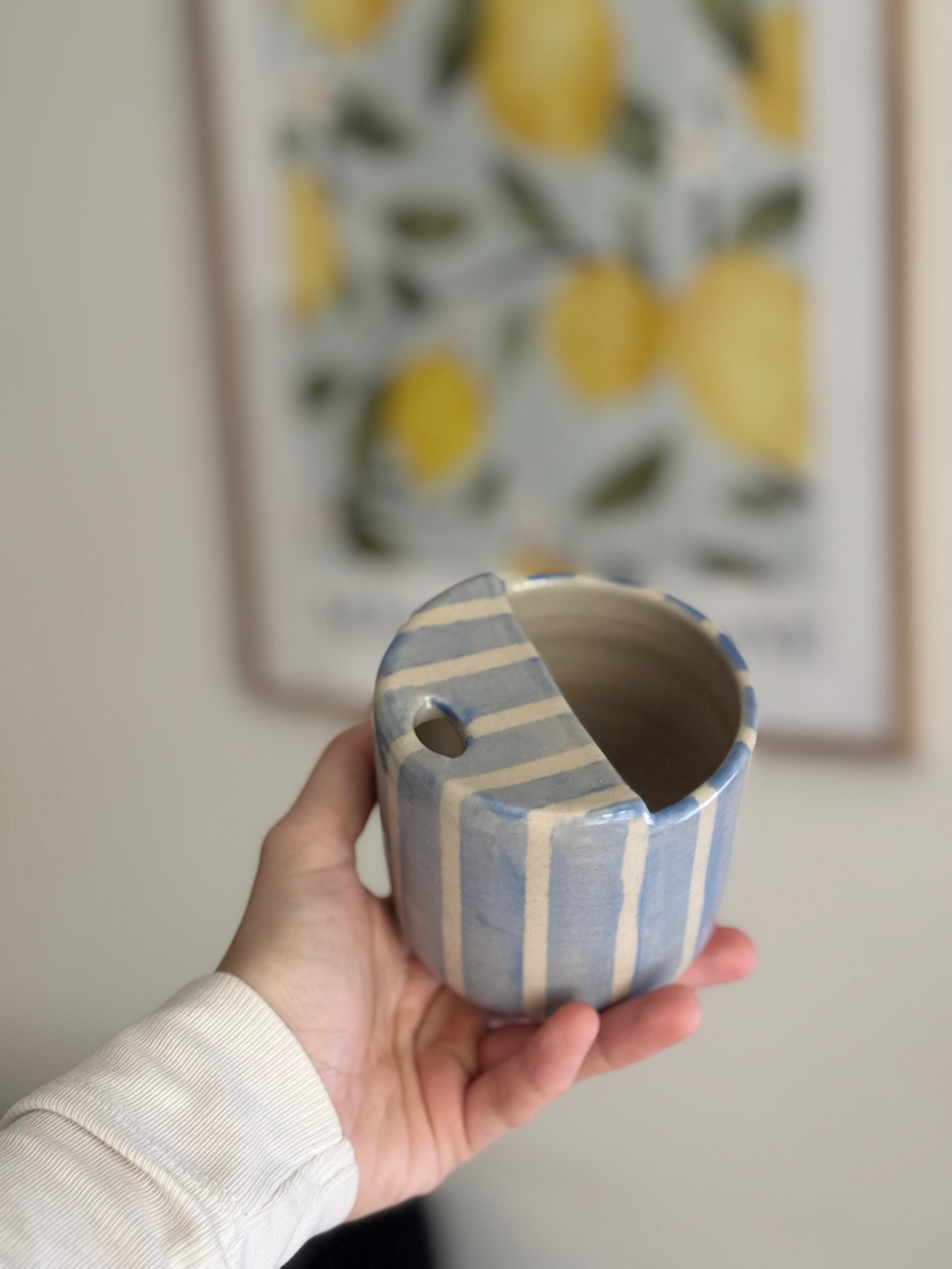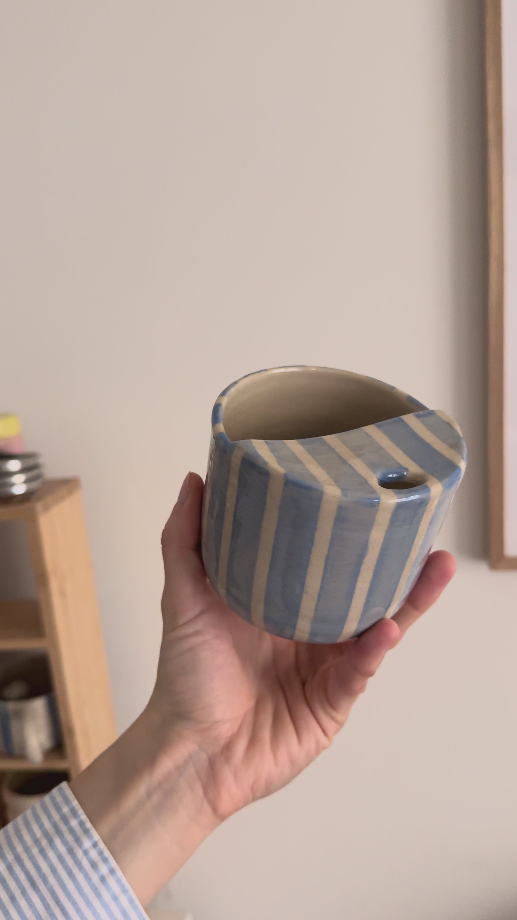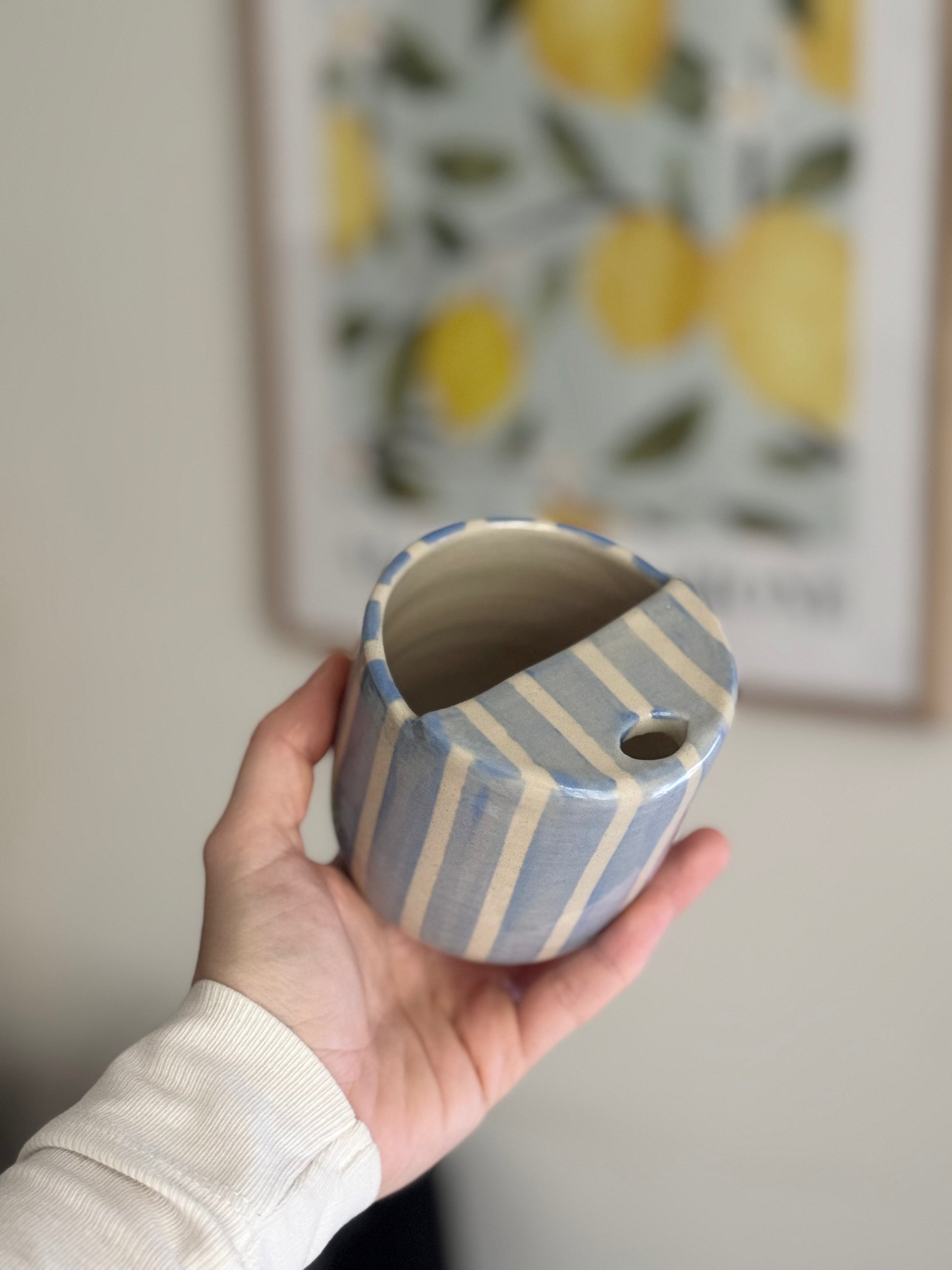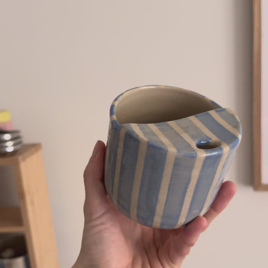 Dieser To-Go Becher ist handgefertigt aus Steinzeugton und mit viel Liebe zum Detail gestaltet. Das auffällige blau-weiße Streifenmuster macht ihn zu einem echten Hingucker – perfekt für deinen Matcha, Kaffee oder Tee unterwegs.