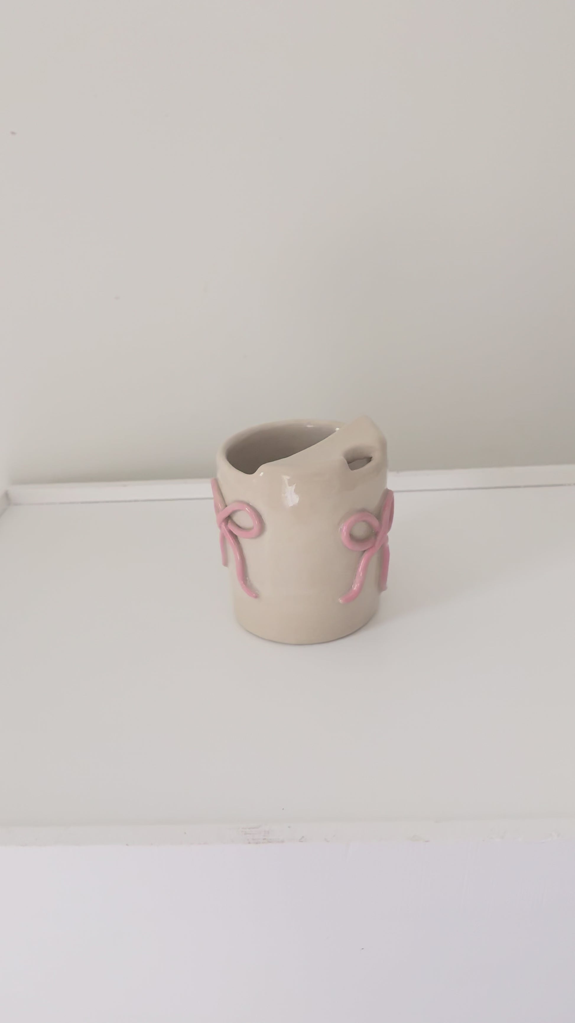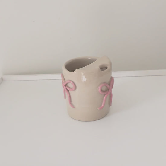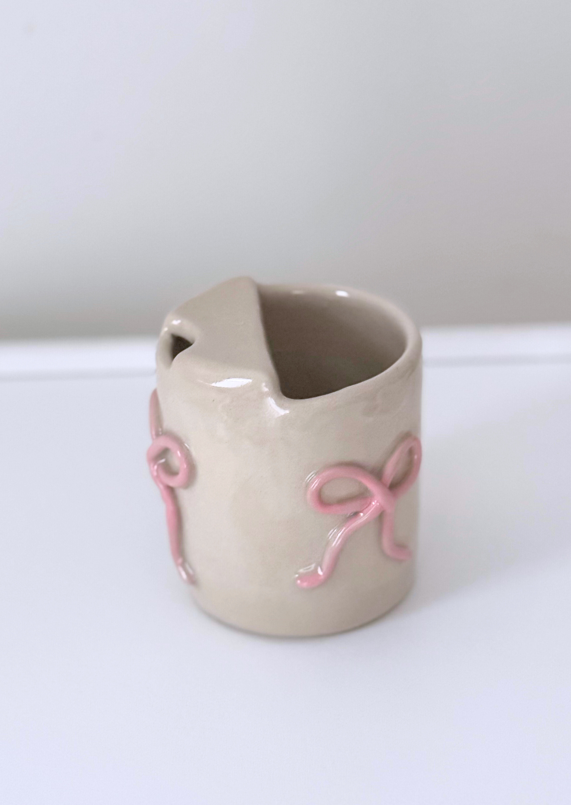 Die kompakte, grifflosse Form liegt angenehm in der Hand und passt in die meisten Getränkehalter sowie Taschen. Die leicht schräge Trinköffnung macht ihn ideal für Kaffee, Tee oder Matcha unterwegs. Die handmodellierten Schleifendetails setzen dezente Akzente und verleihen dem Becher eine besondere, zurückhaltende Optik.